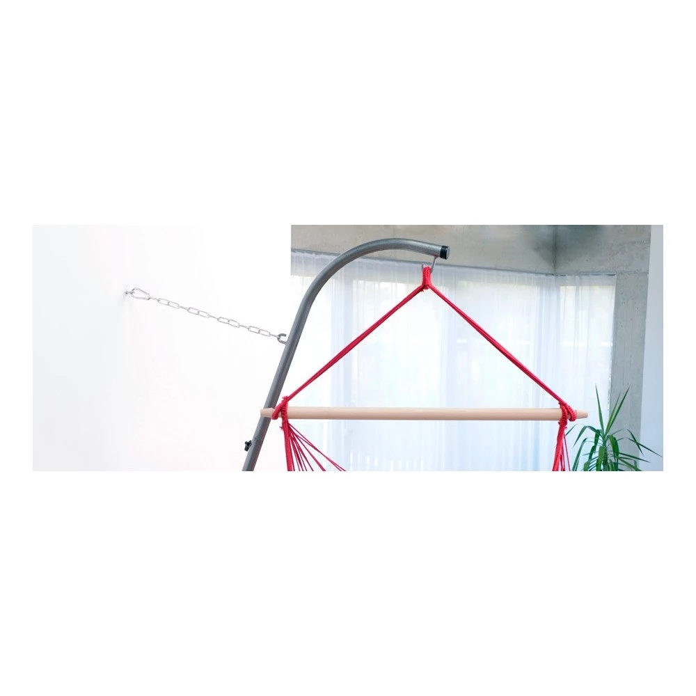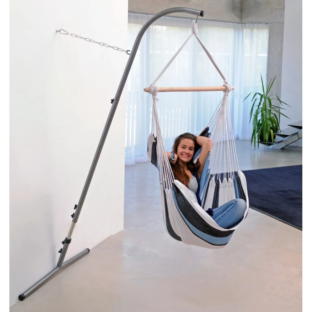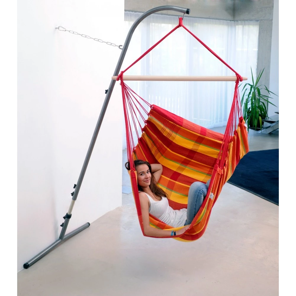 Meget lidt plads er nødvendig for at slappe af i din AMAZONAS hængestol. Palmera stand, specielt udviklet til AMAZONAS hængende stole er sat væk fladt mod væggen, når den ikke skal bruges. På denne måde kan man lave sit eget sted til at svinge og drømme i en tilstand af velvære i selv de mindste rum.