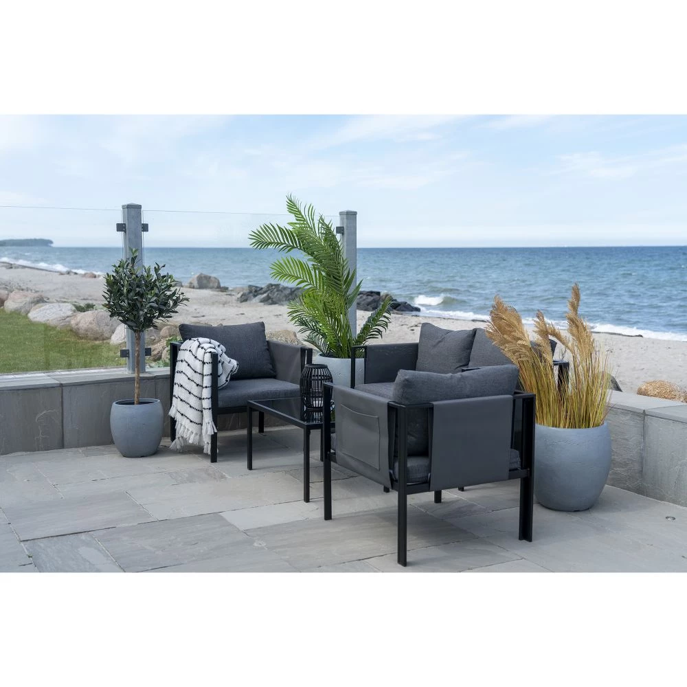 Nice Sofasæt, sort stel med mørkegrå puder, inkl. bord med sort glasplade.
