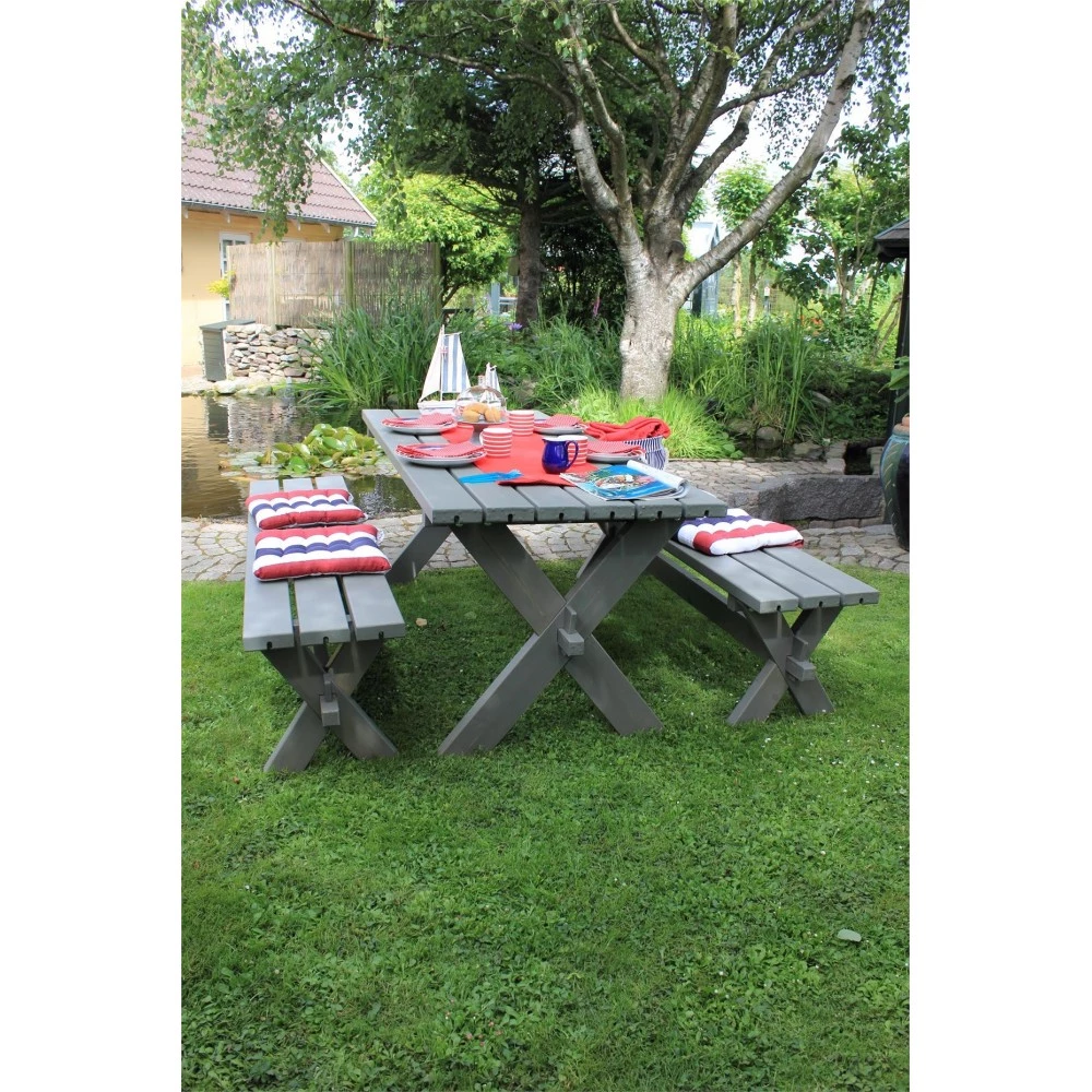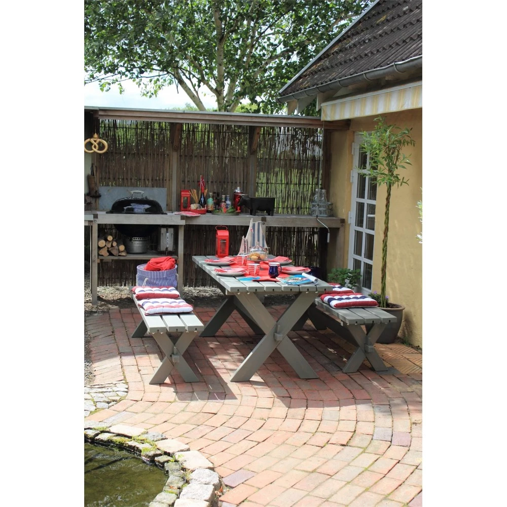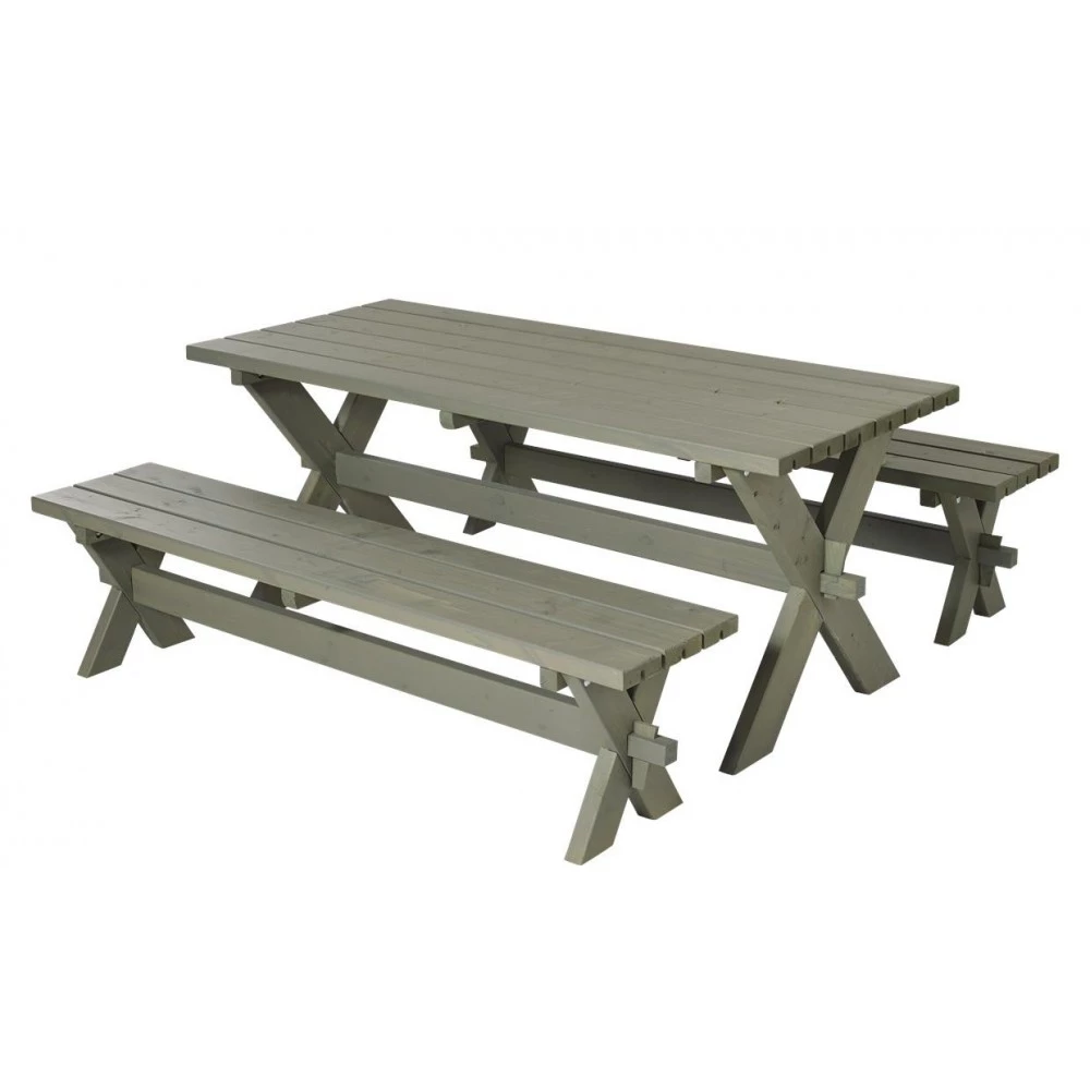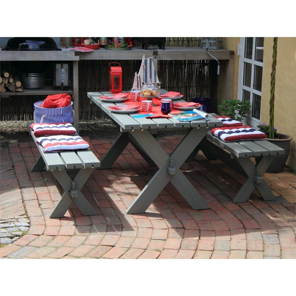 Bord og bænke står på krydsede ben, som er forbundet med en planke på tværs. Det klassiske udtryk er gennemført med